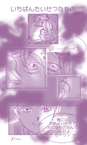 何の拍子か、ふと思い出して“嗚呼、これってガイルク話だな〜”とか思ったのでしたv(我ながらナチュラルすぎてコワイ/笑) 好きなお噺かと問われれば“?”なのですが(だって王さまが影薄くてそこまでする程の相手か?と思う)子供の頃からビョーに頭の中にこびりついてるというか?ガイさまってゆーか?──この4コマにするためにずっと憶えていたんでしょうか?(コレも運命?) さすがに題名を憶えていなくて図書館で借りて来たんですが☆