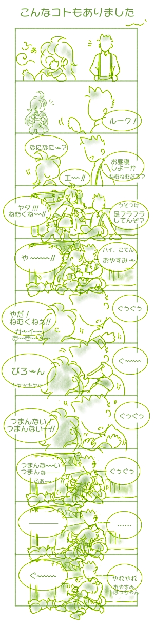 どー見てもあんよがふらふらしてるのに“眠くない!”と主張されるので、オフ友ちゃんとお嬢さまを真ん中に挟んでよくお昼寝ゴッコをしました。“おやすみ〜”と(ベッドに連れてくと暴れるので)ソファのところで寝たふりしてると、しばらくモジモジしてるんですが、そのうち、静かになる。この作戦のキケンなのはオトナも一緒に眠ってしまうこと☆(オトナはいつでも眠いのダ/笑)