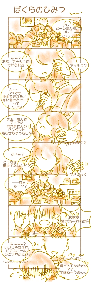 まぁ、でもルークだとケアは出来ないだろーな〜おぼっちゃまは開けるだけ開けて、後のお手入れは使用人兼親友まかせv(開ける瞬間はぎゅって目をつぶっちゃうんだろうなぁ〜vカワイイなぁ〜vvv←バカです)